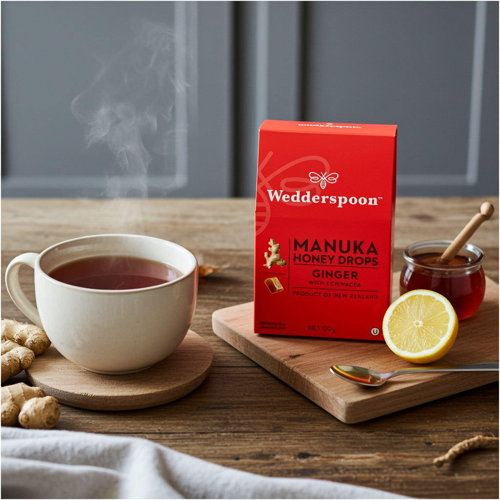 Experience the soothing relief of our time-tested recipe, carefully crafted in small batches in New Zealand. Ideal for cold, flu, and allergy season, Wedderspoon's Manuka Honey Drops in Ginger flavour are a comforting remedy for your throat. Formulated with genuine Manuka Honey from New Zealand and enriched with Echinacea, renowned for its immune-boosting properties, these drops provide a slow-dissolving action that coats and soothes your throat.
