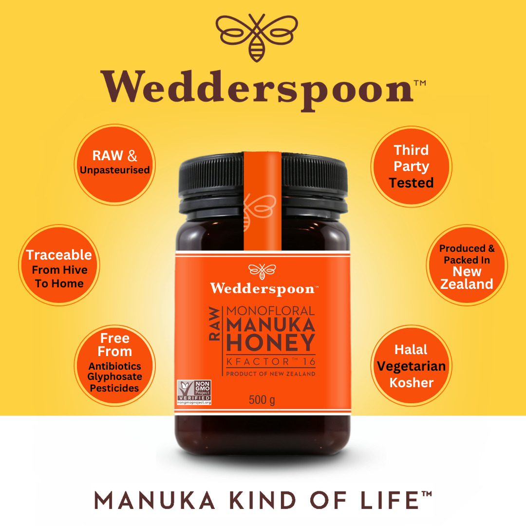 KFactor 16 Monofloral Manuka Honey guarantees to meet or surpass the New Zealand Government's Monofloral Manuka Standard, with a minimum of 75% manuka pollen. By considering factors like pollen count, purity, and live enzymes, KFactor provides a more accurate measure of effectiveness. With complete traceability from our South Island hives to your home, sourced and packed in New Zealand, we ensure the utmost integrity in our Manuka honey. Wedderspoon Manuka Honey is triple-filtered and gently creamed, offering a rich, smooth flavour to delight your taste buds.